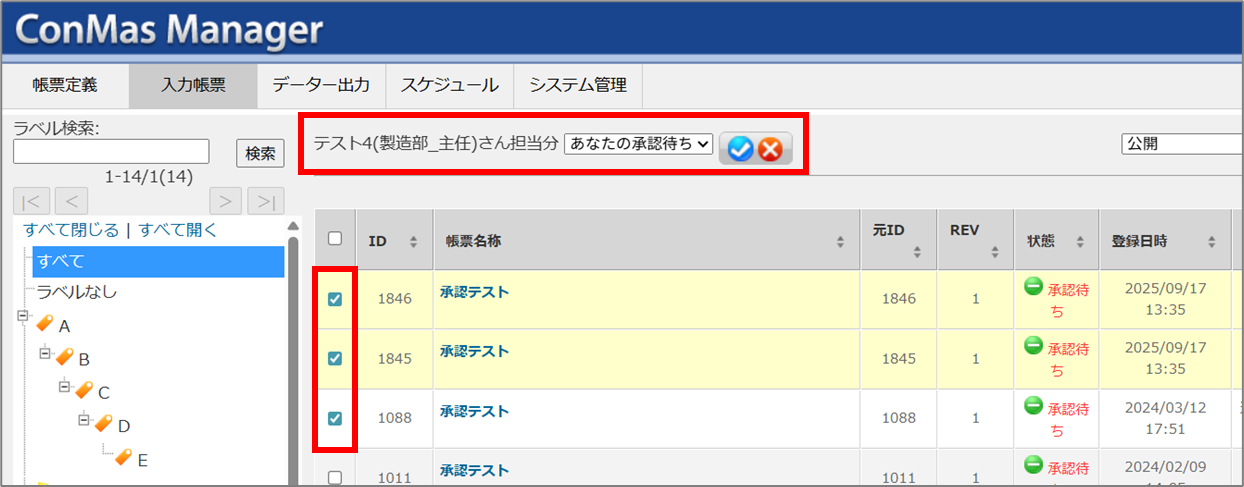 入力帳票一覧画面上部の「承認ステータス」で「あなたの承認待ち」を選択すると、「一括承認・差し戻しボタン」が表示されます。 \