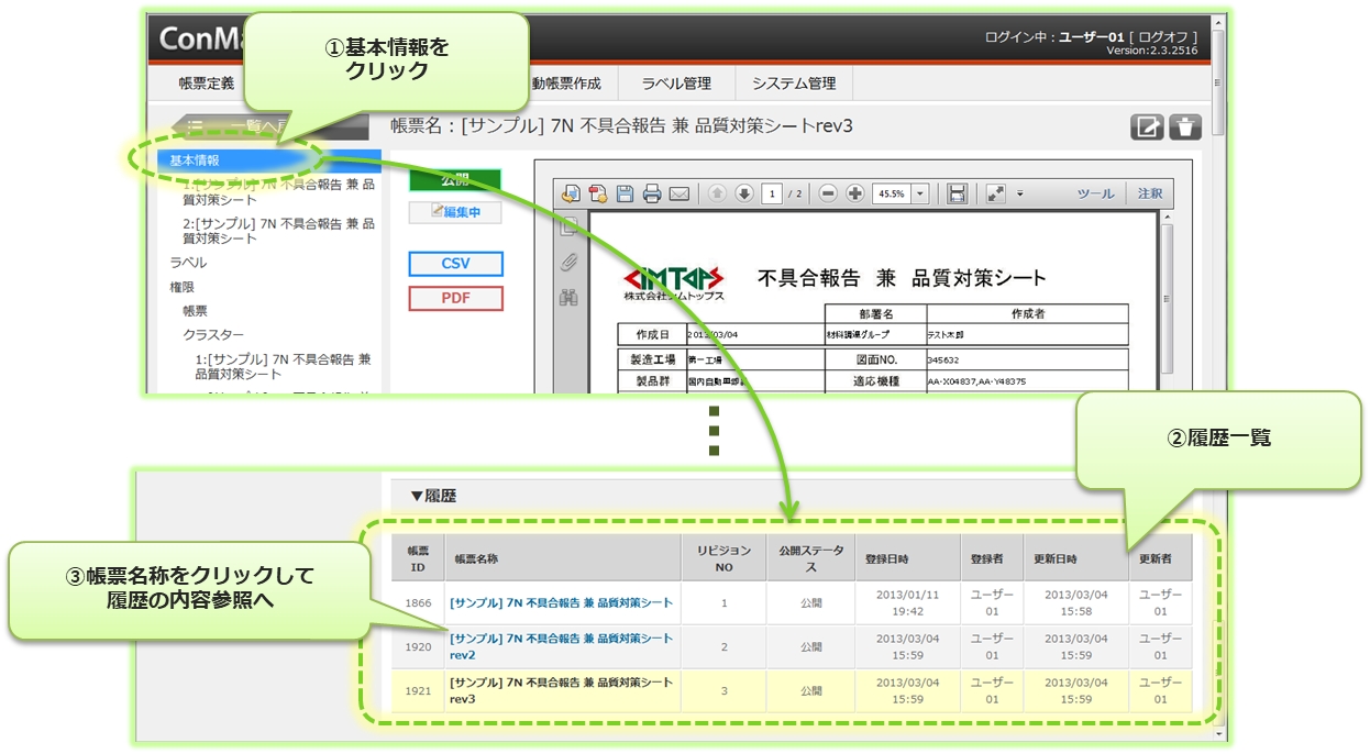 帳票定義・入力帳票の履歴(リビジョン)管理