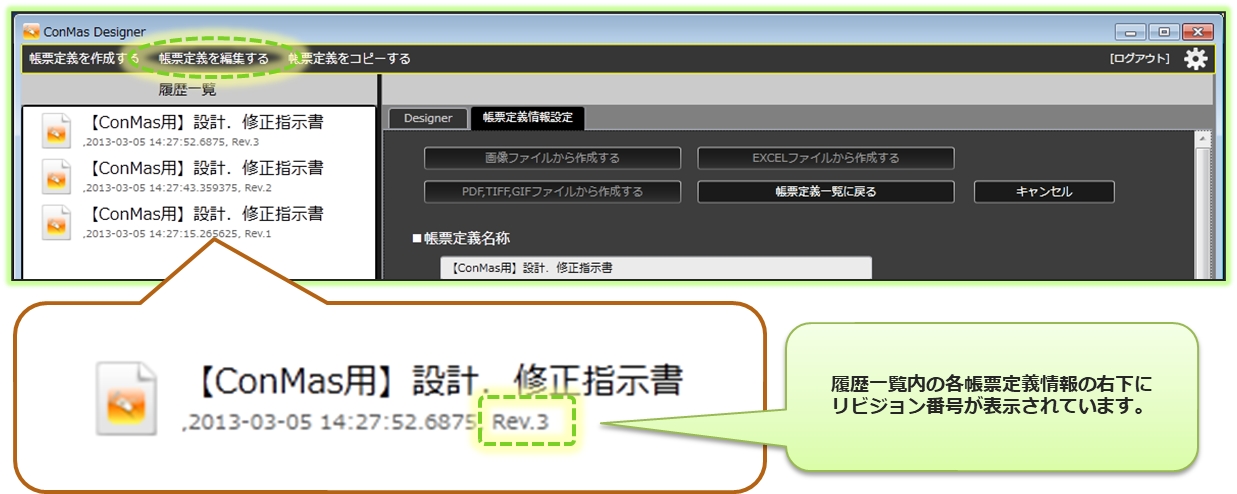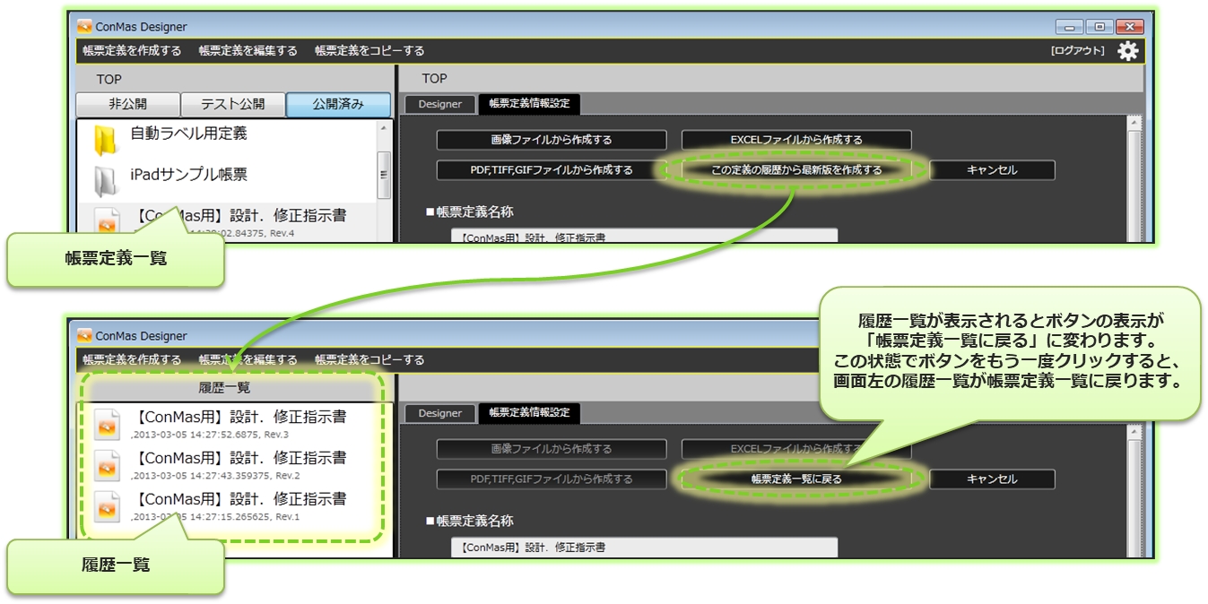 ConMas Designerを使用して、帳票定義の履歴から最新版を作成することができます。