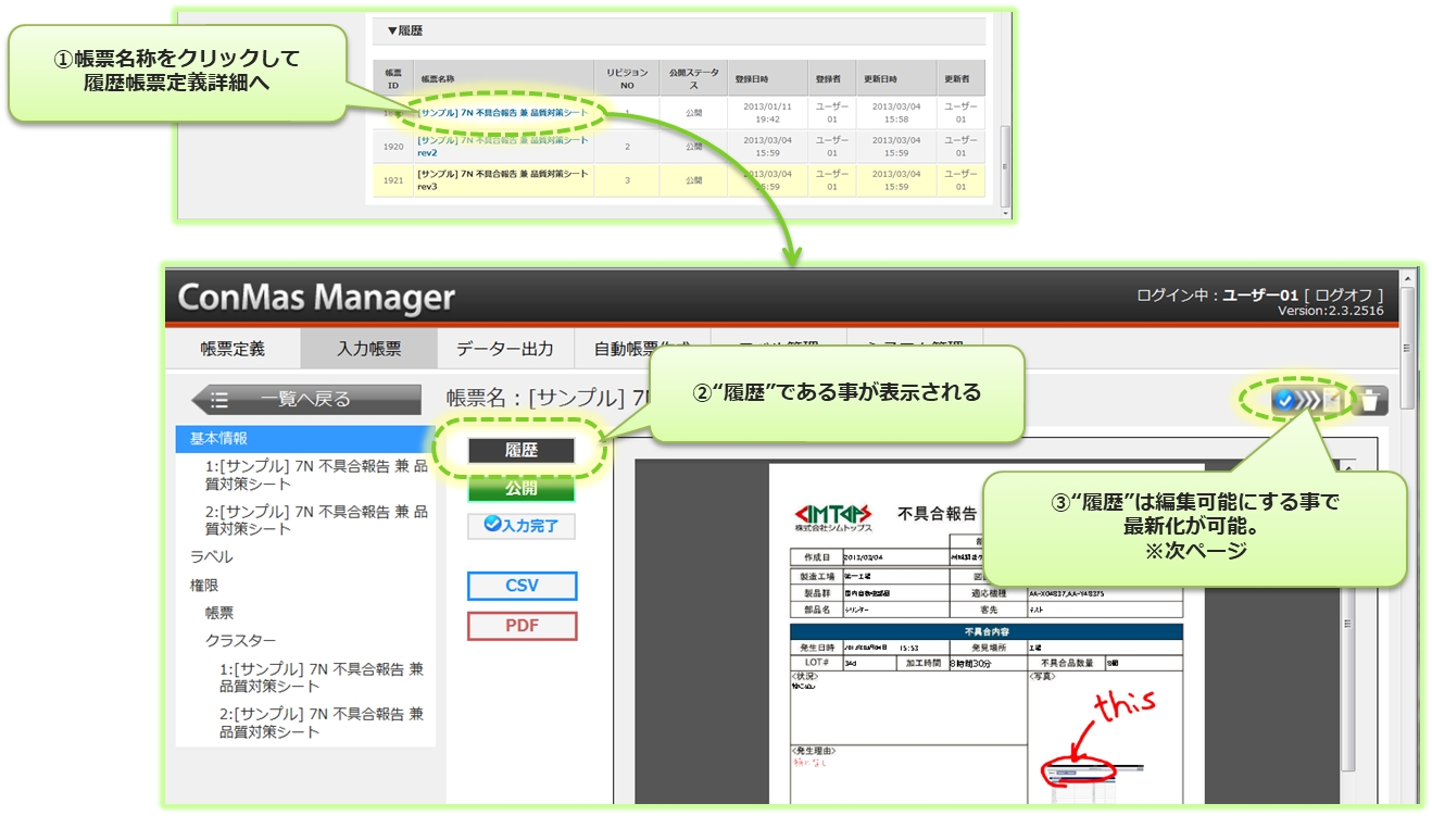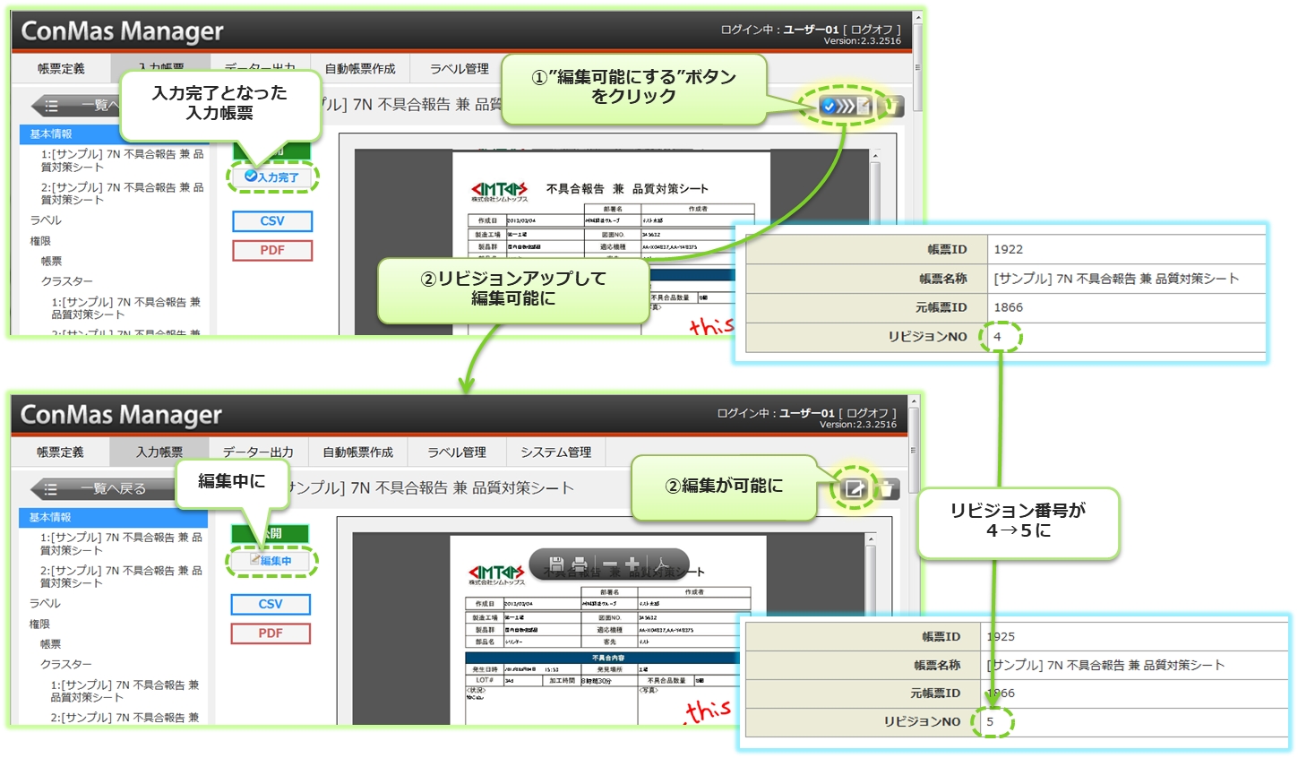 入力帳票におけるリビジョンアップのタイミング 「入力完了」となった入力帳票をConMas Managerにて「編集可能」にした時。
