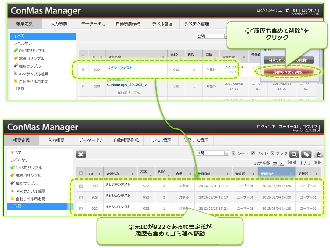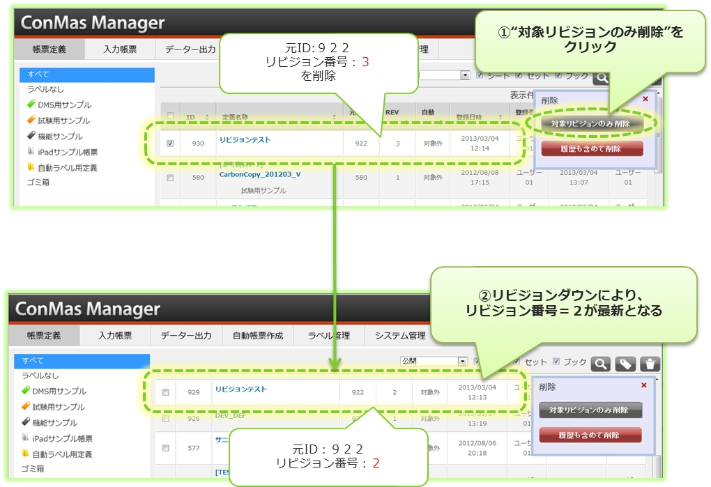 帳票定義、入力帳票を削除するとリビジョンダウンが発生し、履歴が存在する場合は、一つ前の履歴が「最新」となります。 これをリビジョンダウンと呼びます。 またリビジョンダウンではなく、全履歴を一括で削除することも可能です。