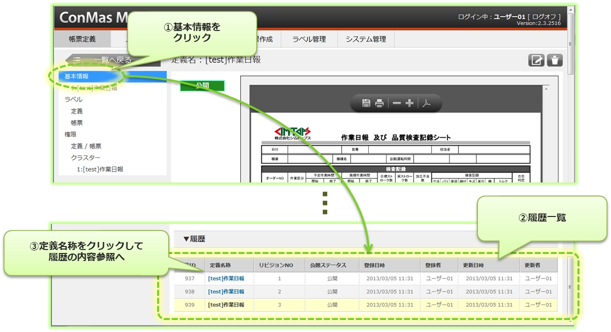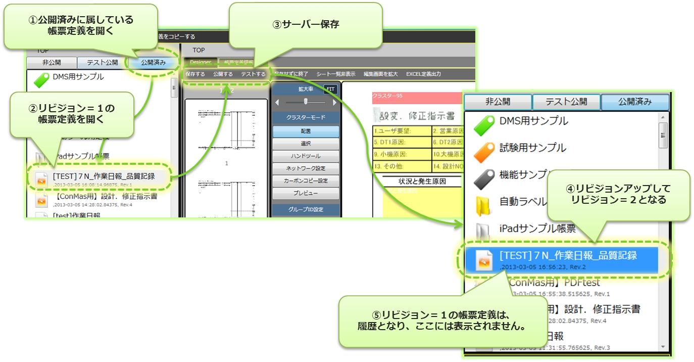 ConMas Designerにて、「公開済み」に属している帳票定義を開き、「保存する」、「公開する」、「テストする」のいずれかをクリックしてサーバー保存を行うと、元の帳票定義に上書き保存せず、リビジョンアップして新規で帳票定義を作成します。 この時、元の帳票定義は、履歴として残ります。
