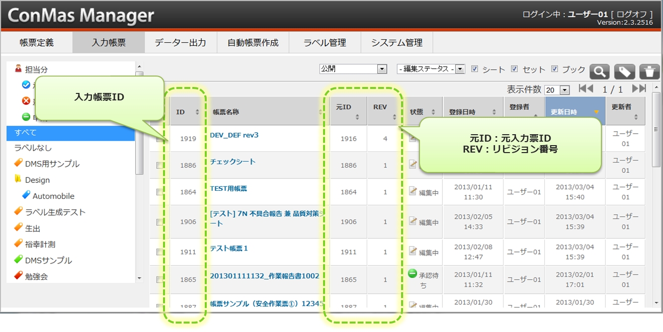 入力帳票一覧の「ID」列、「元ID」列、「REV」列 により、履歴の有無が一覧上で確認できます。 一覧で表示される入力帳票は「最新」のみとなります。