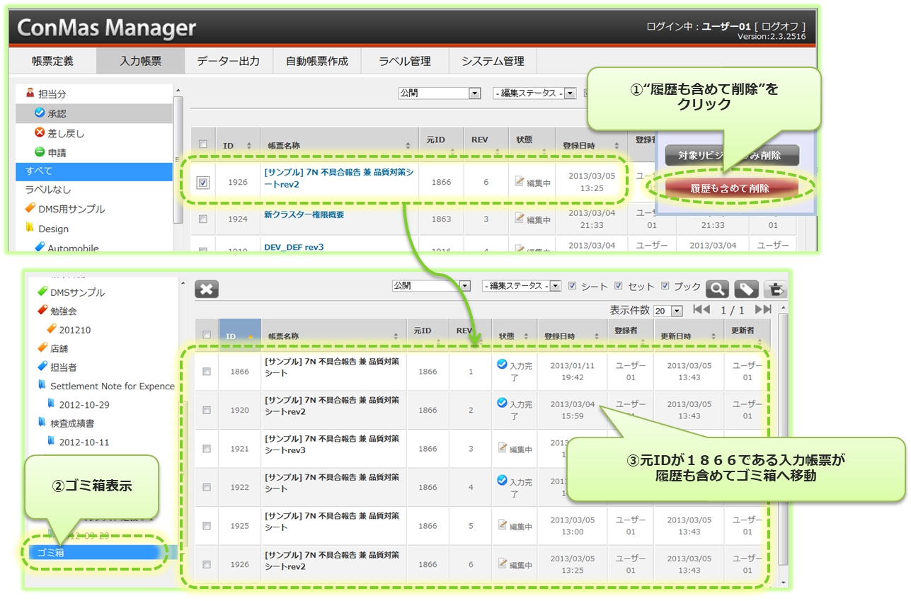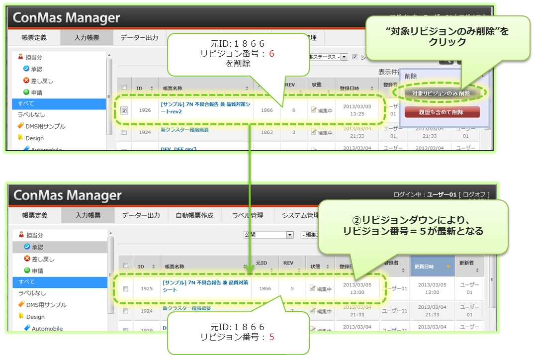 指定されたリビジョンの入力帳票のみ削除します。 履歴が存在した場合はリビジョンダウンが発生し、一つ前のリビジョンの入力帳票が「最新」となります。