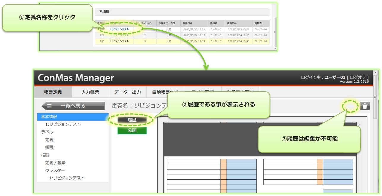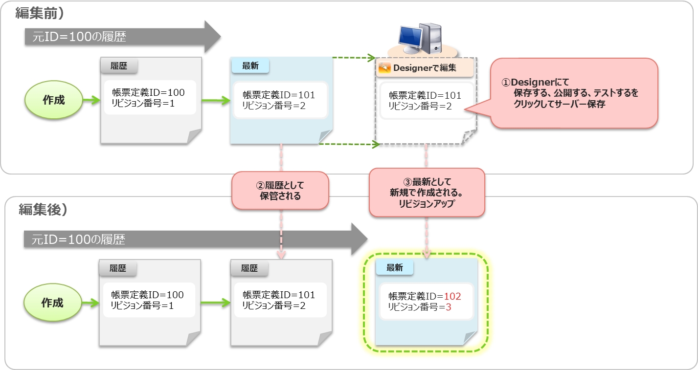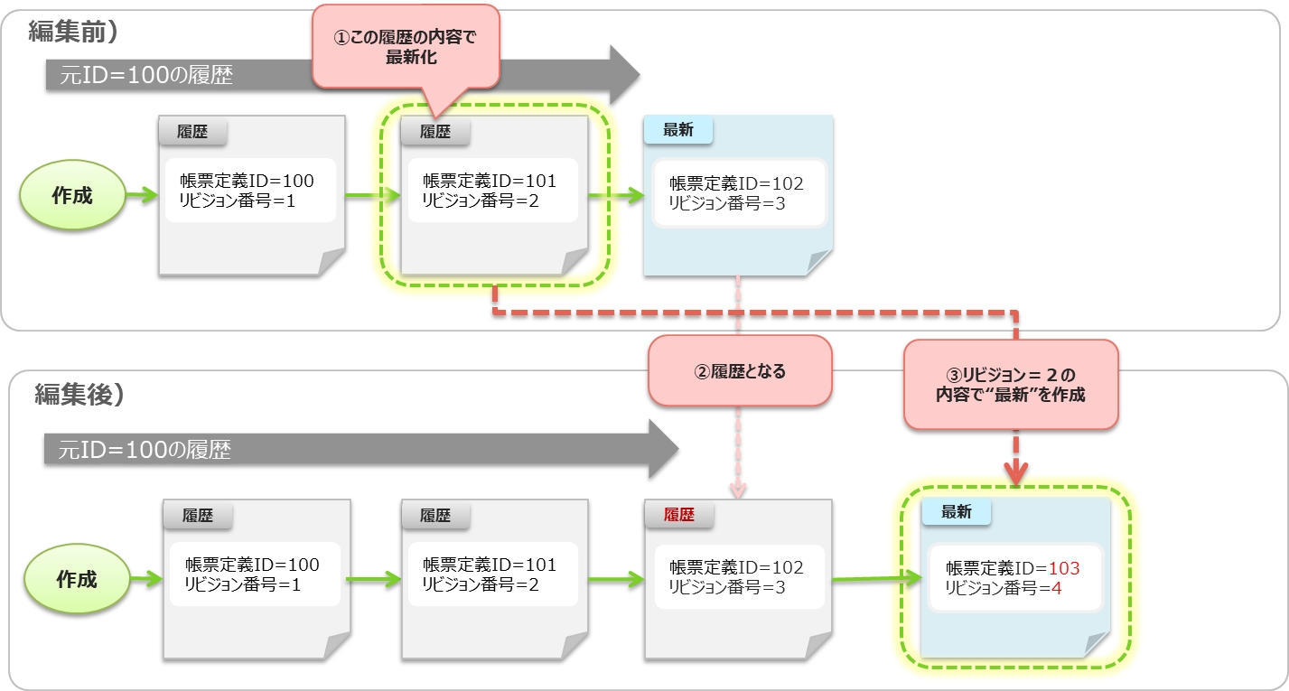 帳票定義、入力帳票は、それぞれある編集タイミングでの内容を履歴として残し、編集後の帳票定義、入力帳票を新たに作成します。 この操作をリビジョンアップと呼びます。