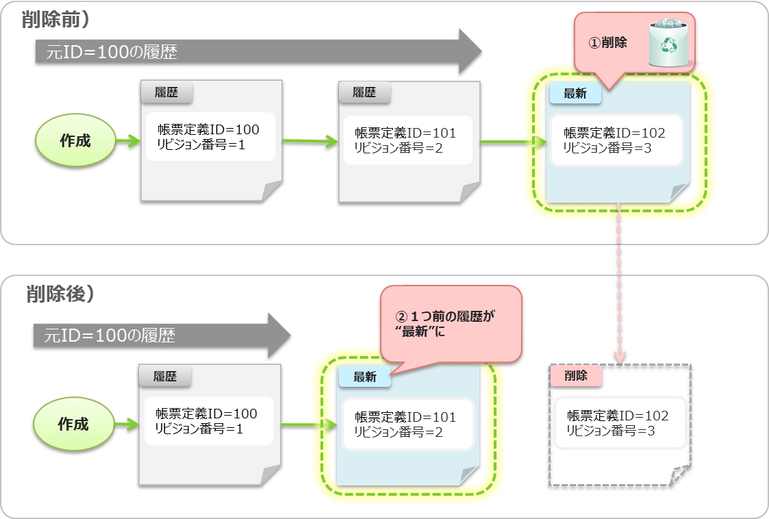 指定されたリビジョンの帳票定義のみ削除します。 履歴が存在した場合はリビジョンダウンが発生し、一つ前のリビジョンの帳票定義が「最新」となります。