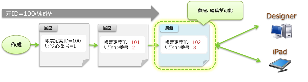 同じ元IDの帳票定義、入力帳票内でリビジョン番号が最大のものを「最新」と呼びます。 「最新」の帳票定義、入力帳票のみ、ConMas Designer や i-Reporterアプリ にて 参照・編集 が可能となります。