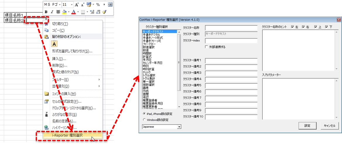クラスターとしたいセルを選択(複数可)して右クリックメニューを表示します。 メニューの一番下に表示される『i-Reporter 種別選択』(または『i-Reporter Setting (2013)』)をクリックするとアドインが起動します。