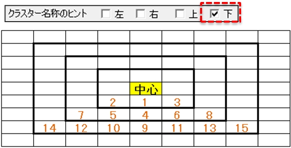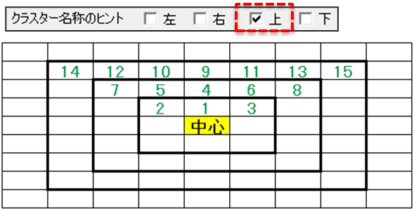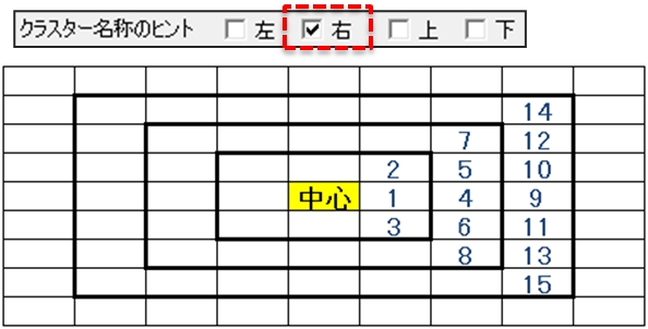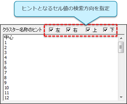クラスター名称のヒント一覧上部のチェックボックス アドインを起動したセルを中心として「左」「右」「上」「下」のどの方向へセル値を検索し、候補とするかを指定します。 複数のチェックボックスを指定していた場合、「左」>「右」>「上」>「下」の優先順で周囲のセル値を検索していきます。