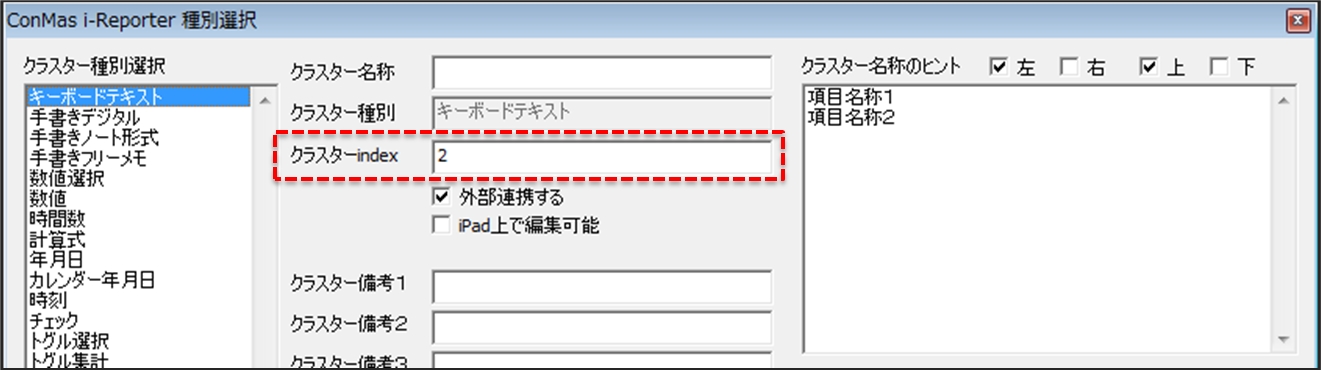 クラスター名称は任意に入力できます。 画面右の「クラスター名称のヒント」から選択して入力もできます。 空白にした場合は、Designerで取り込んだ際に自動で名称がセットされます。