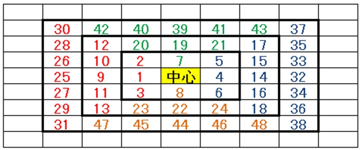 「左」「右」「上」「下」すべてにチェックを入れた場合のセル検索順番(図中の数値がセル値の検索順番)