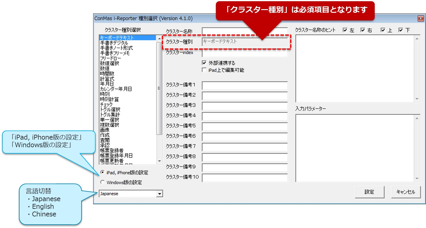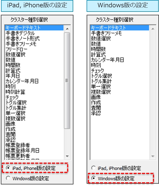 「iPad, iPhone版の設定」を選択するとすべてのクラスター種別がリストに表示されます。 「Windows版の設定」を選択した場合、Windows版で使用可能なクラスター種別のみがリストに表示されます。