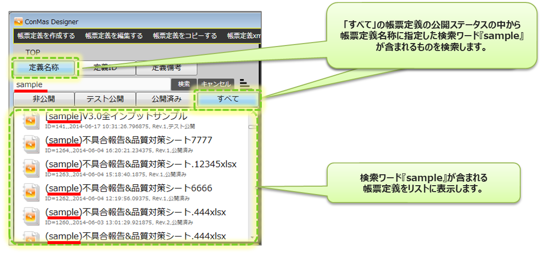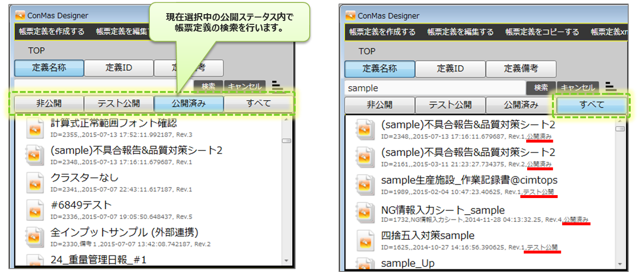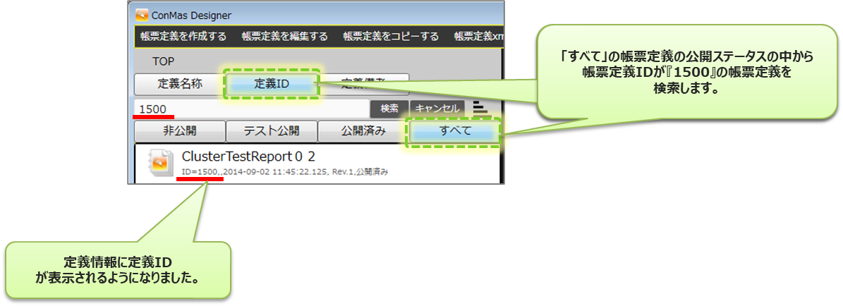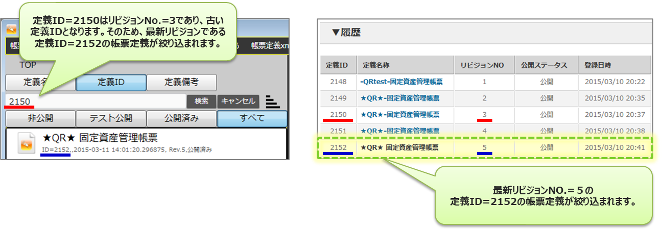 リビジョンが古い「定義ID」で検索を行った場合の検索