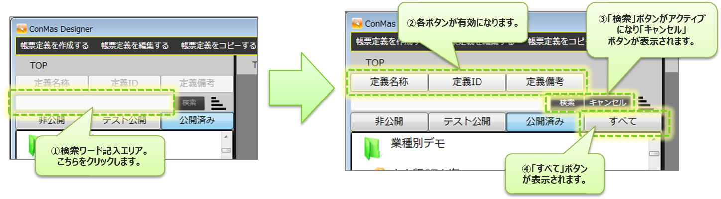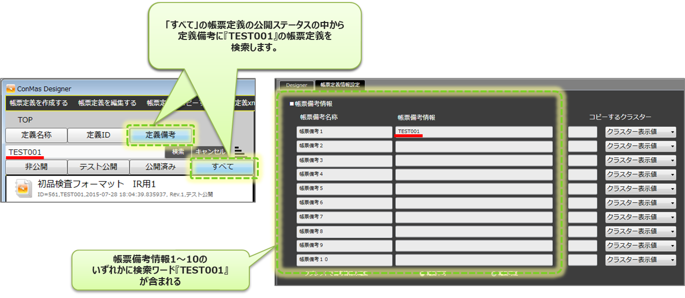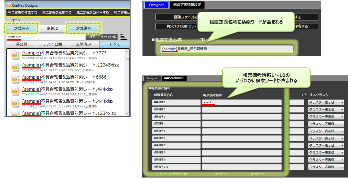 検索対象を「定義名称」と「定義備考」とした場合の検索