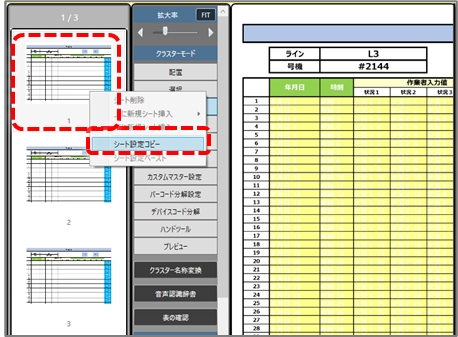 クラスターモードを「配置」「選択」「固定」のいずれかにして、シート一覧上で、設定をコピーしたいシートを選択状態にしてから右クリックメニュー内の「シート設定コピー」をクリックします。