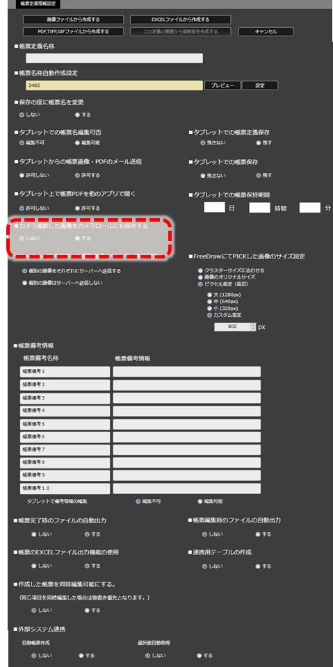 iPadのカメラで撮影した画像を入力帳票に保持するだけでなく、iPad本体のカメラロールにも保存するか、しないかの設定を行います。 「する」に設定した場合には、撮影した写真が自動的にカメラロールに保存されます。
