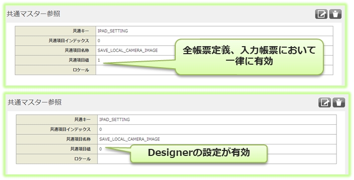 共通項目値を“1”にすると全帳票定義/入力帳票にてカメラロール保存が有効になります。 共通項目値を“0”にすると(ConMas Designerで設定された)帳票定義ごとの設定に従います。