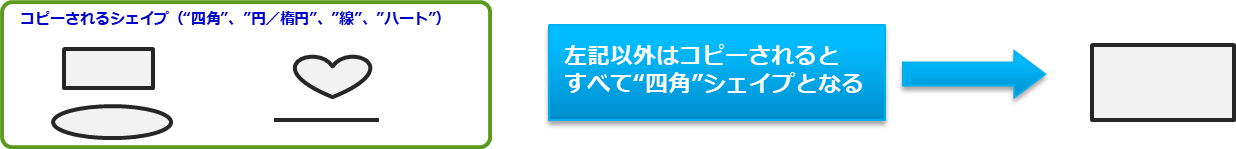 “四角”、”円/楕円”、”線” オートシェイプはコピーされますが、それ以外のオートシェイプはコピー先で”四角”として表示されます。