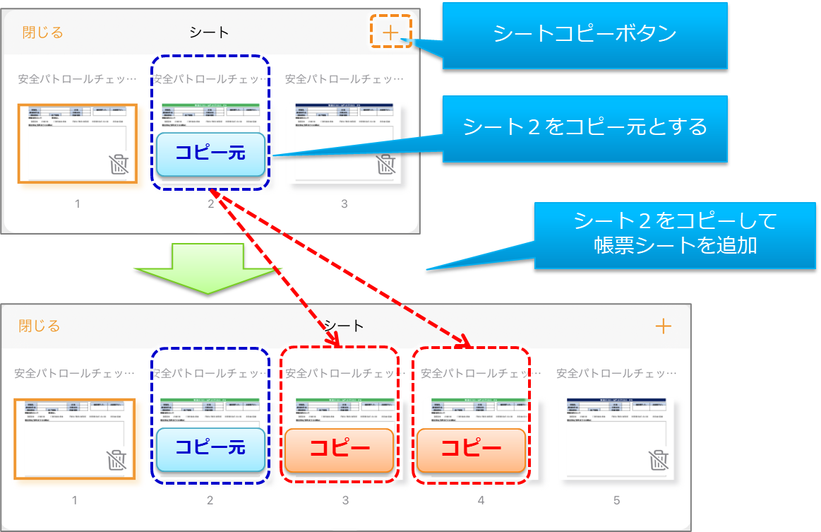 ”○of○”アイコンをタップすることで、帳票のシート名とプレビューが表示されます。 右上にある”+”アイコンをタップすると、シートコピーの実行画面が表示されます。