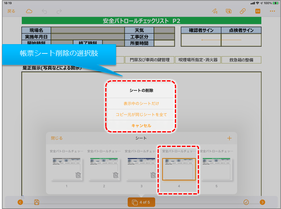 「消去する」をタップすると、帳票シート削除の選択肢が表示されます。 コピーした帳票シートの削除には、「表示中のシートだけ」と「コピー元が同じシートを全て」の2つの方法があります。