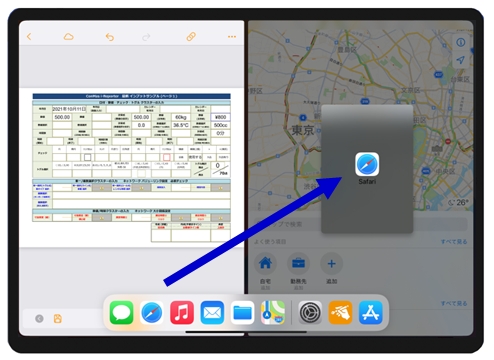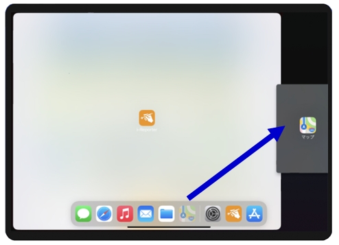 i-Reporterアプリの方を、Slide Over表示させた例。好きな場所に移動させることができます。
