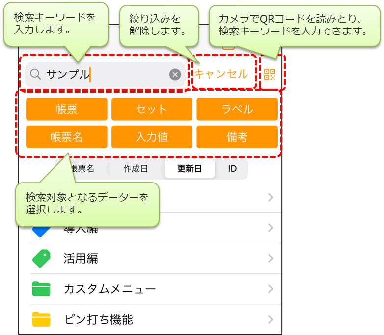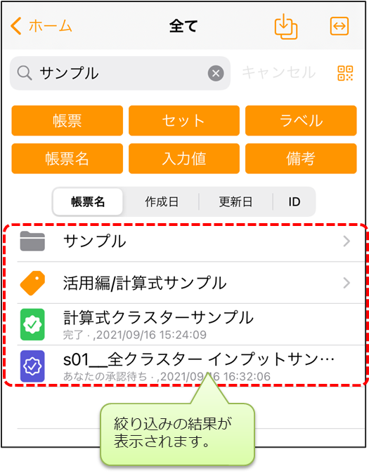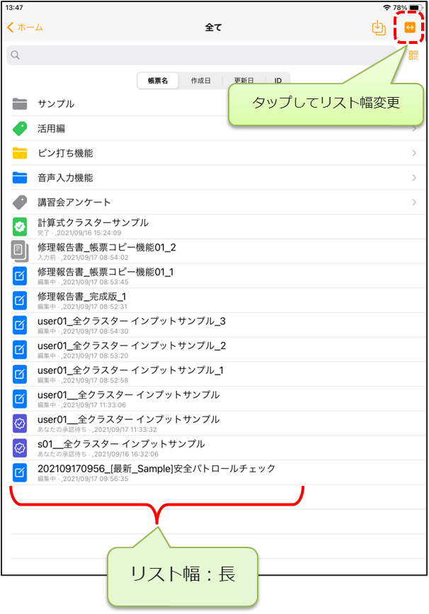 全て タブレットに保存された入力帳票を、すべて表示します。