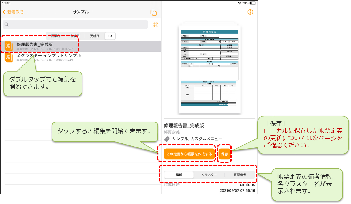 サムネイルの下にある「この定義から帳票を作成する」ボタンは、新規帳票の作成画面を開きます。 「保存」ボタンは、選択中の帳票定義をローカルに保存します。 「情報」「クラスター」「帳票備考」ボタンは、下部に詳細情報が表示されます