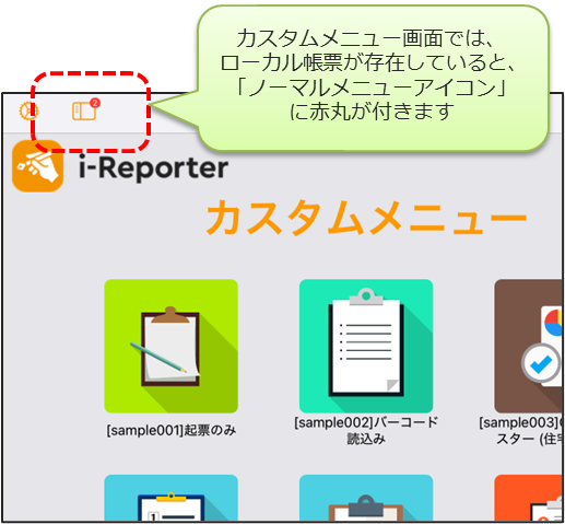 カスタムメニュー画面では、ローカル帳票が存在していると、「ノーマルメニューアイコン」に赤丸が付きます。