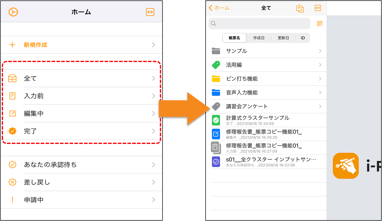 「入力帳票」はリストの「全て」「入力前」「編集中」「完了」など、i-Reporter アプリで入力を行う帳票を指します。