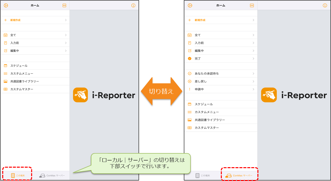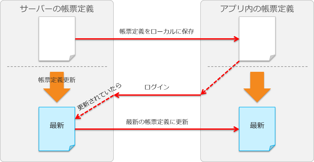 i-Reporter アプリへのログイン時に、ローカル帳票ライブラリーに保存されている帳票定義が更新されていれば、最新の帳票定義に更新します。