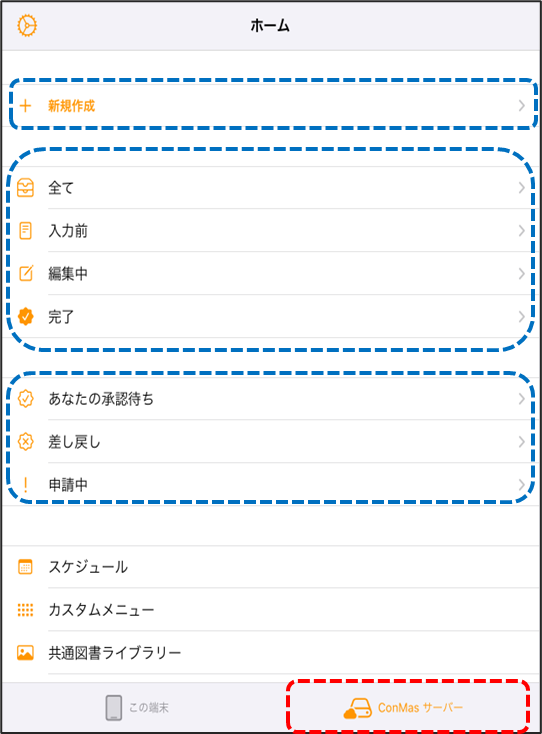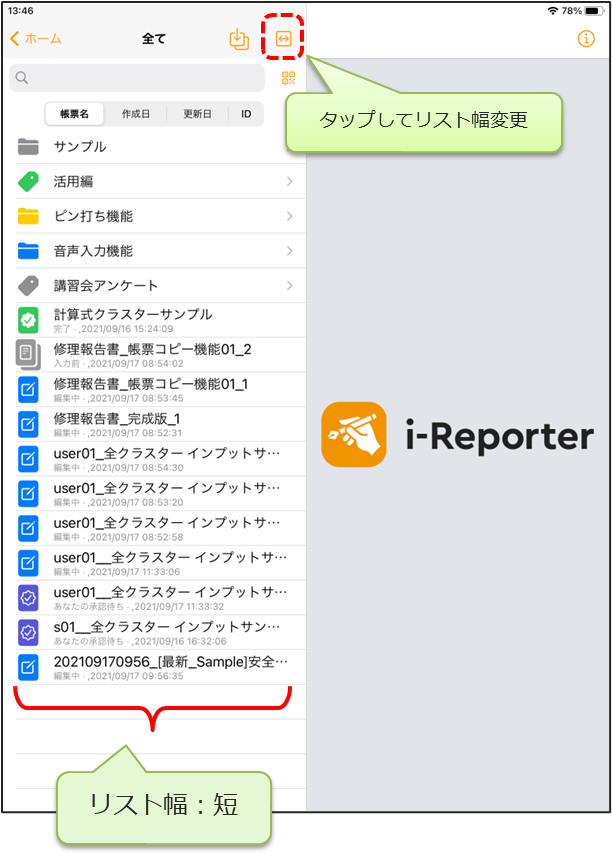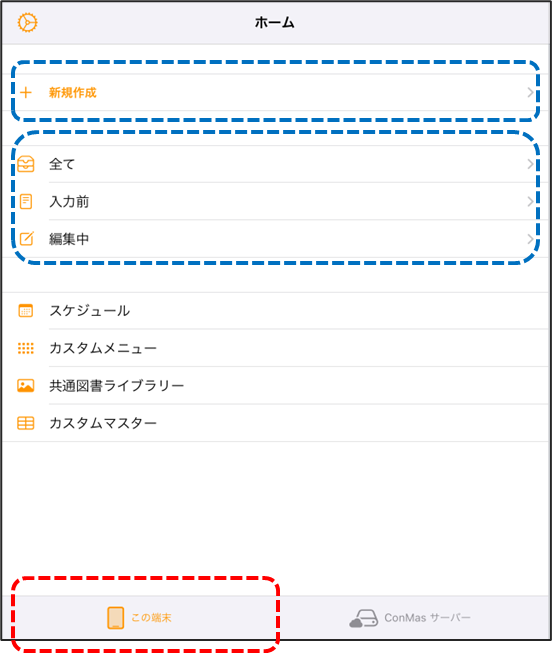 i-Reporterアプリを起動した時に、最初に表示される画面です。 帳票編集終了時にも表示されます。