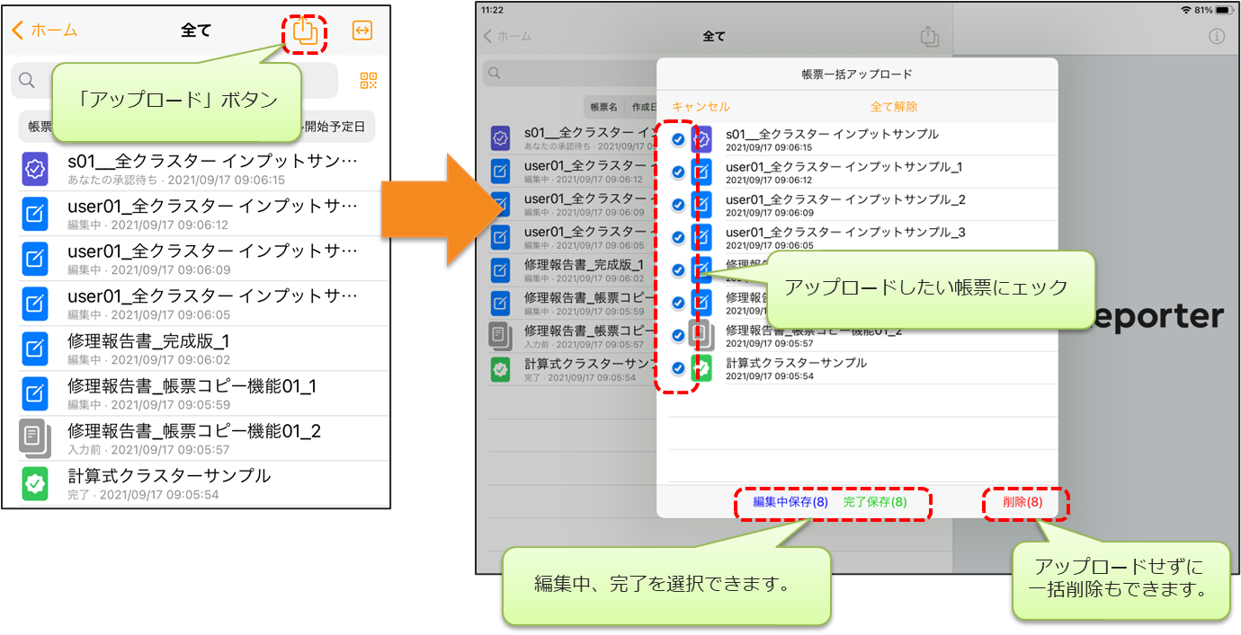 ローカルの「全て」「入力前」「編集中」の入力帳票を一括でアップロードできます。