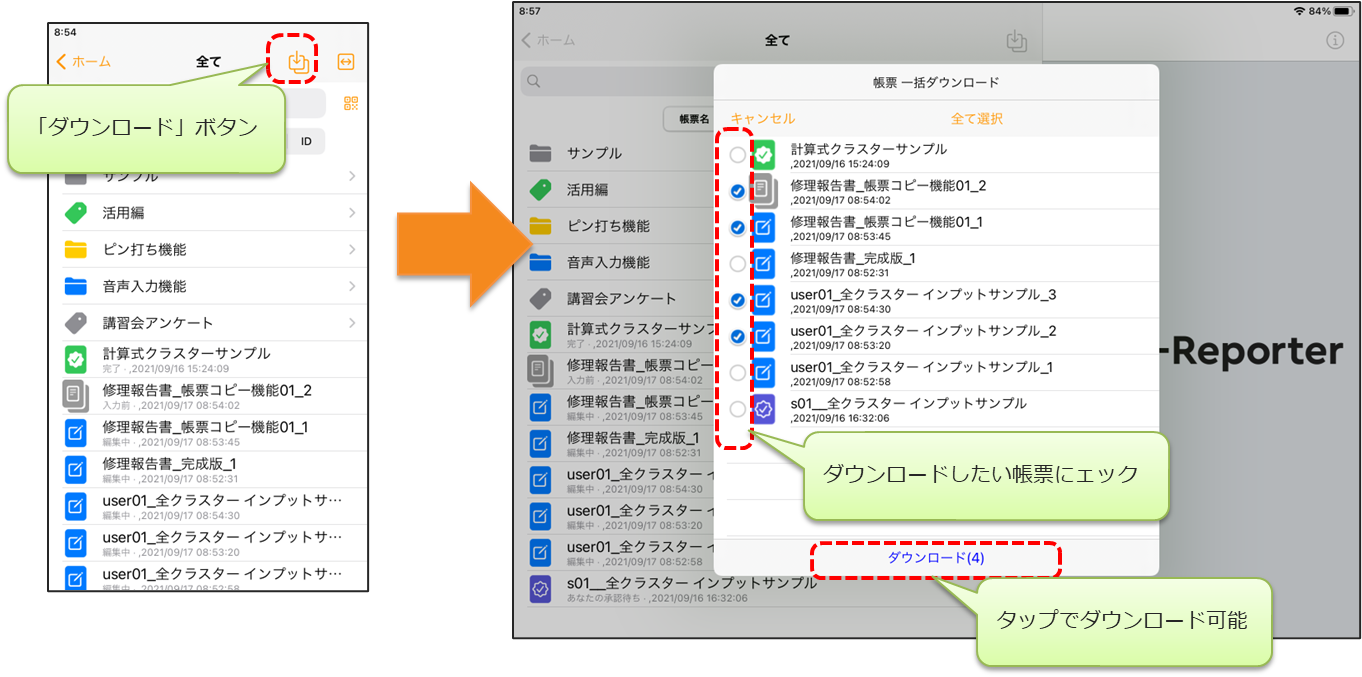 サーバー帳票ライブラリーで、リスト上部の「ダウンロード」をタップすると、一括ダウンロード画面が表示されます。 各行の左端にある丸をタップしてチェックし、下部の「ダウンロード」ボタンでローカルに保存できます。保存した帳票定義、帳票はローカル帳票ライブラリーで確認できます。