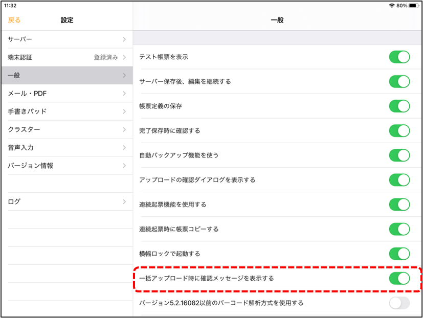 「設定」 > 「一般」 > 「一括アップロード時に確認メッセージを表示する」をオンにすると、一括アップロード時に確認メッセージが表示されます。