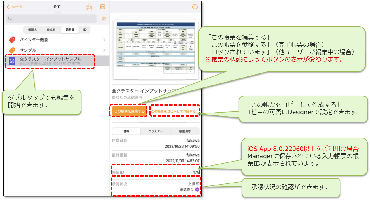 「入力帳票」は帳票のリストを表示し、帳票の編集やコピーができます。 リストの帳票をタップすると、右側に詳細情報が表示されます。 サムネイルの下にある「この帳票を編集する」ボタンは、帳票の編集画面を開きます。 「この帳票をコピーして作成する」ボタンは、その帳票を入力値とともにコピーして、別帳票として編集画面を開きます。