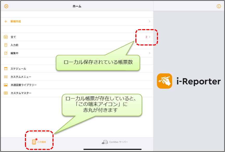 ローカル帳票が存在していると、「この端末アイコン」に赤丸が付きます。 「全て」の右側に、ローカル保存されている帳票数が表示されます。