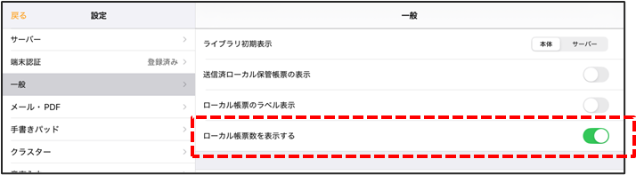 i-Reporterアプリの「設定」 > 「一般」 > 「ローカル帳票数を表示する」 をオンにすると、機能がONになります。