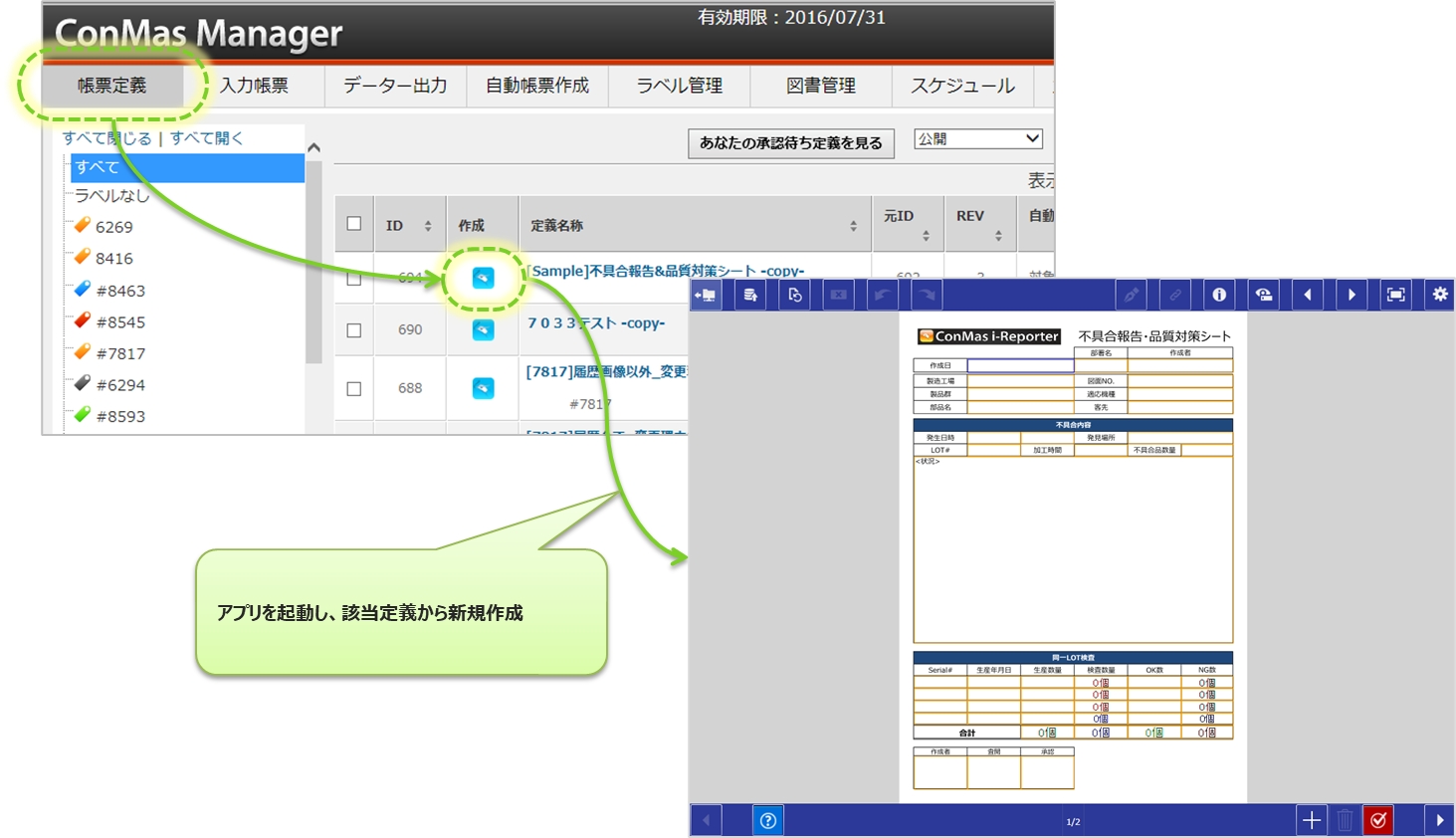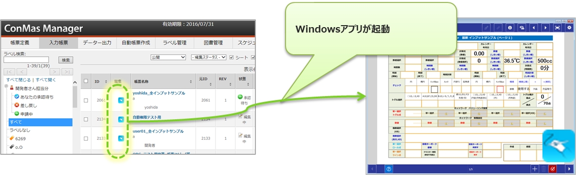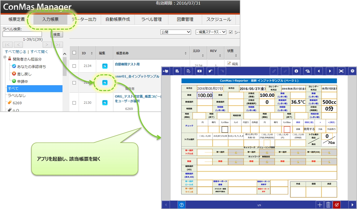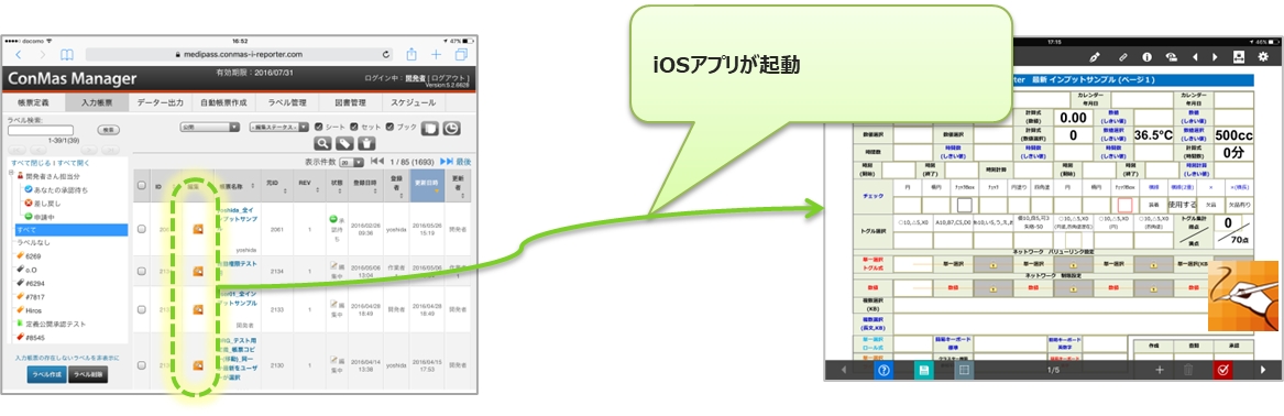 Windows端末、iOS端末上で、ConMas Managerから直接i-Reporterアプリを起動し、対象定義から起票、帳票の編集ができます。