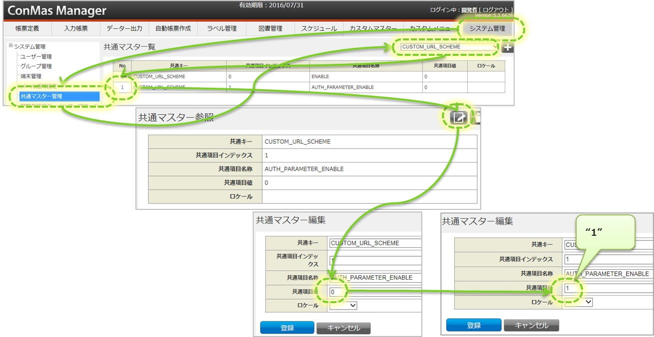 共通項目値 “0”:しない(アプリで手動ログインする) “1”:する(ConMas Managerログインユーザーで自動認証)