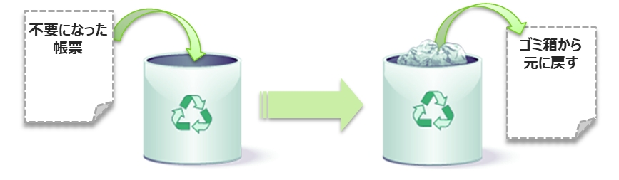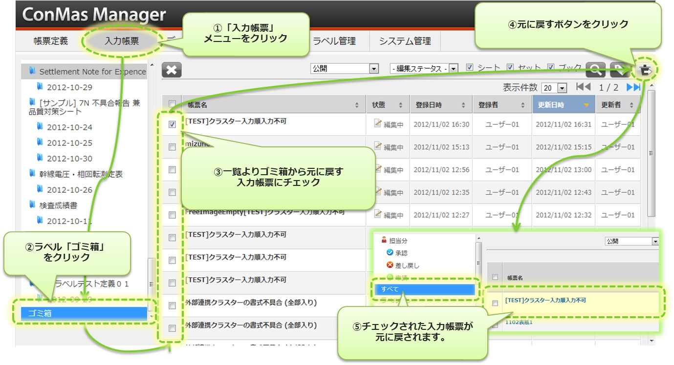 ラベル「ゴミ箱」をクリックすると、論理削除された入力帳票と「元に戻す」ボタンが表示されます。 一覧より「ゴミ箱」から元に戻したい入力帳票にチェックをいれます。 画面右端の「元に戻す」ボタンをクリックすると、チェックの入った入力帳票が「ゴミ箱」から元に戻されます。