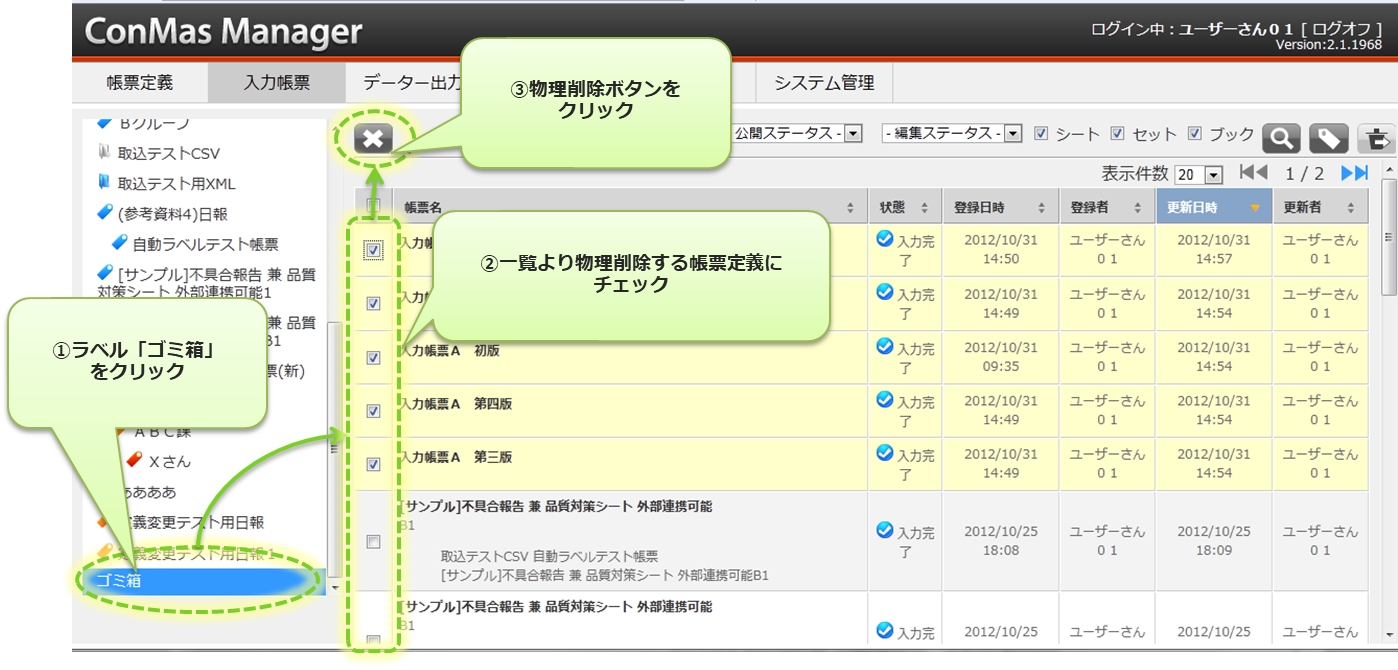 ラベル「ごみ箱」をクリックすると、論理削除された入力帳票と物理削除ボタンが表示されます。 物理削除する入力帳票にチェックを入れ、物理削除ボタンをクリックして、物理削除を実行します。