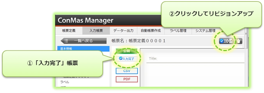 【リビジョンアップ(改版)とは】 一度入力完了した入力帳票を、再度編集可能にすることです。