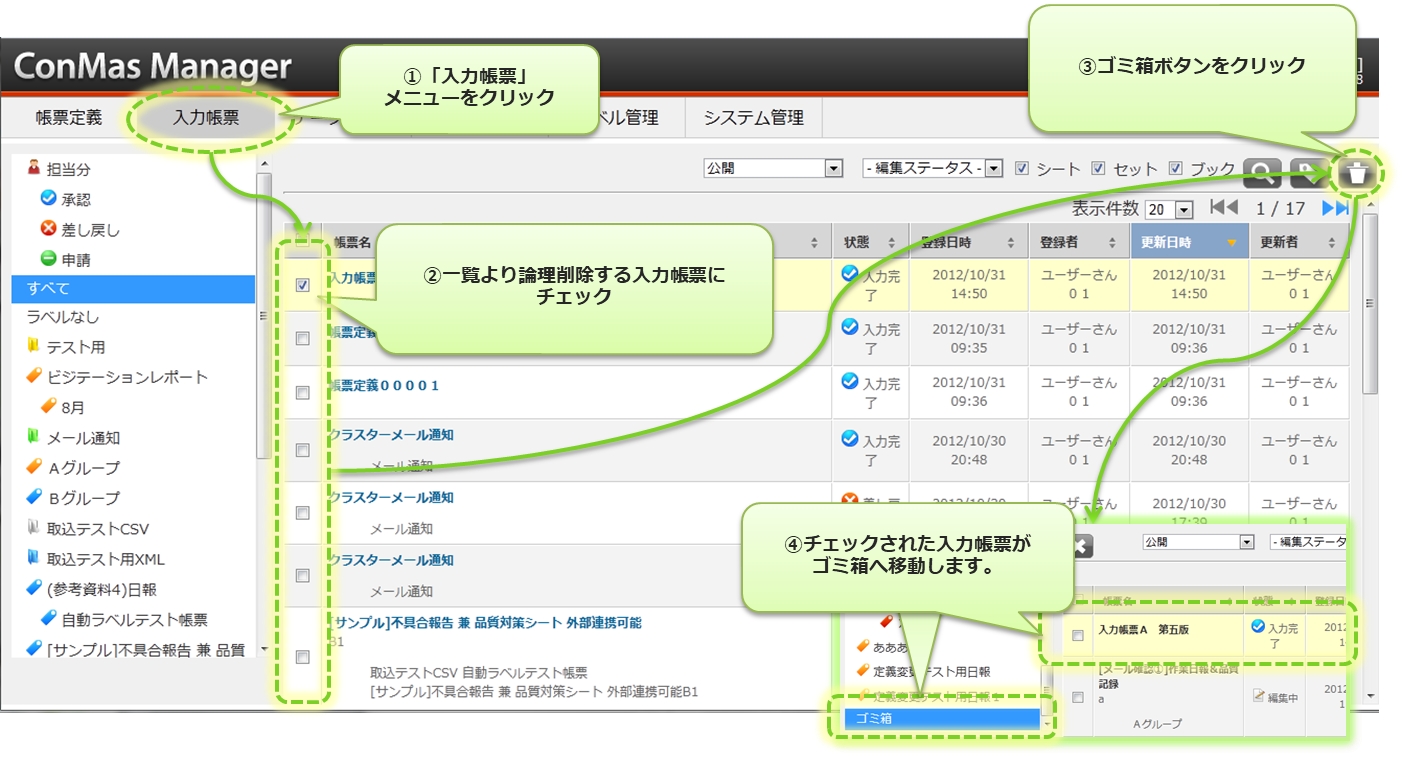 メニュー「入力帳票」をクリックすると、入力帳票一覧画面が表示されます。 一覧より論理削除する入力帳票にチェックをいれます。 画面右端の「削除」ボタンをクリックすると、チェックの入った入力帳票がラベル「ゴミ箱」へ移動します。