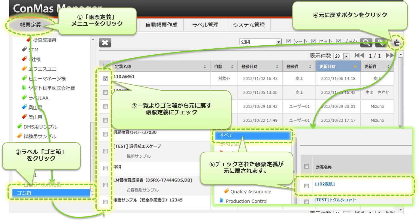 ラベル「ゴミ箱」をクリックすると、論理削除された帳票定義と「元に戻す」ボタンが表示されます。 一覧より「ゴミ箱」から元に戻したい帳票定義にチェックをいれます。 画面右端の「元に戻す」ボタンをクリックすると、チェックの入った帳票定義が「ゴミ箱」から元に戻されます。