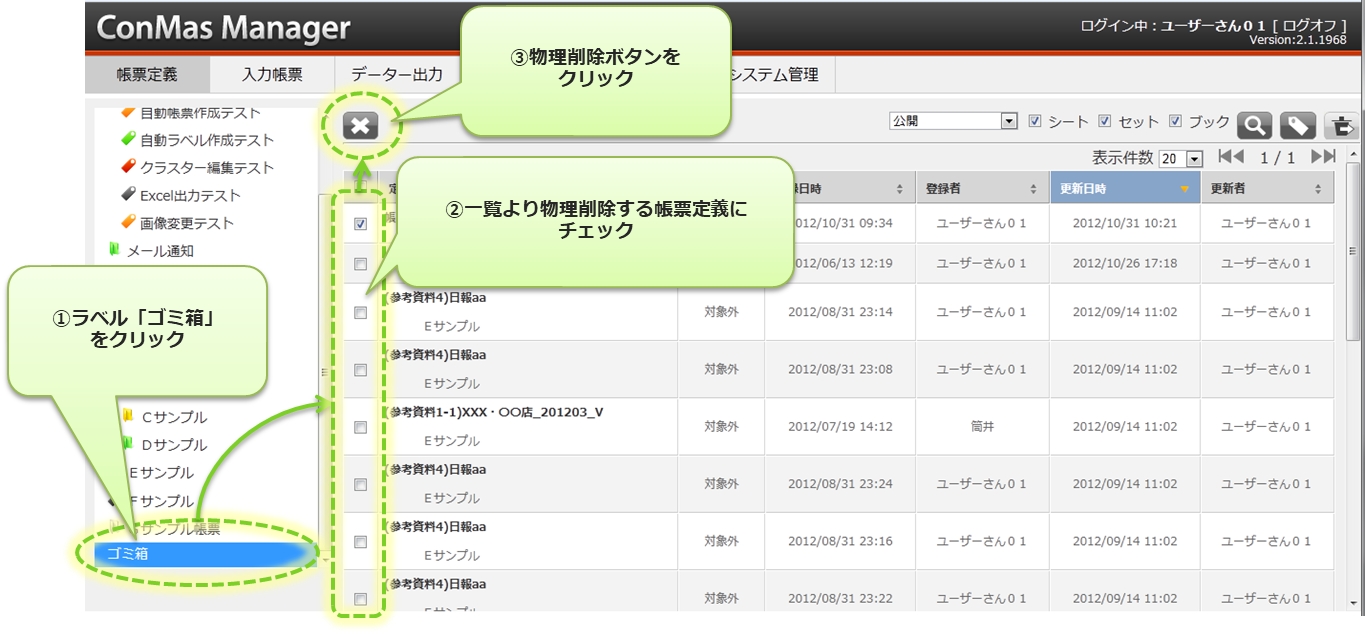 ラベル「ごみ箱」をクリックすると、論理削除された帳票定義と物理削除ボタンが表示されます。 物理削除する帳票定義にチェックを入れ、物理削除ボタンをクリックして物理削除を実行します。