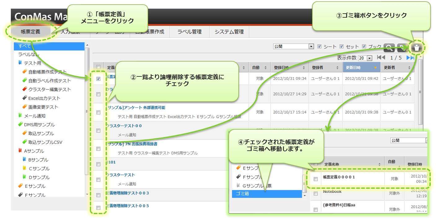 ConMas Designer や i-Reporterアプリ上にダウンロードができなくなります。 自動的に帳票定義一覧、入力帳票一覧の「ゴミ箱」に入ります。 「ゴミ箱」から元に戻すことが可能です。