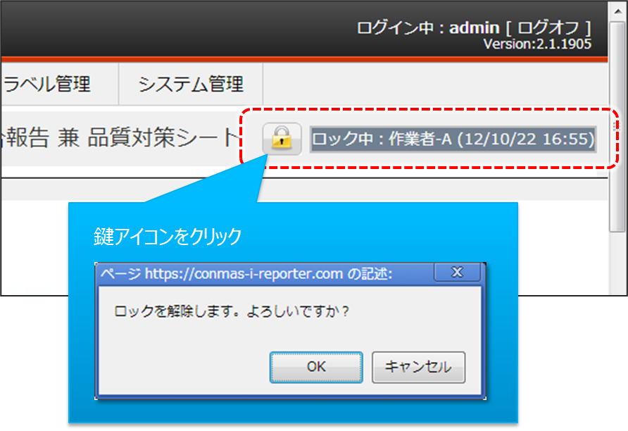 帳票定義、入力帳票のデーターは、編集が競合しないようにロックによる排他制御が行われます。 鍵アイコンで強制的に解除することができます。