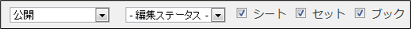 • 一覧の絞り込み 一覧では主要な情報を使って絞り込むためのセレクトボックスやチェックボックスが表示されます。この例は「入力帳票」の一覧の絞り込みの例です。