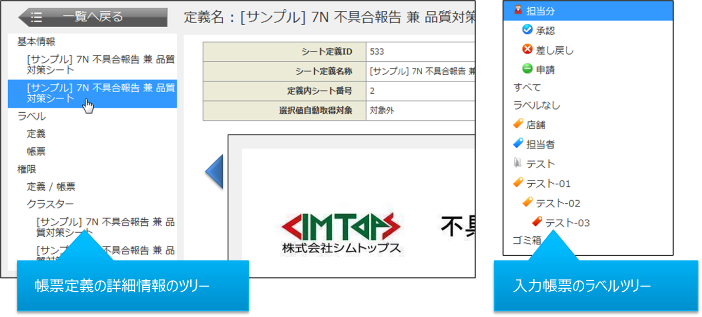 メインメニューの各項目から先では、作業内容により左側にサブメニューが表示されます。 サブメニューでは、各機能別にラベルや、帳票定義・入力帳票の情報、シート別の情報などがツリー形式で表示され、選択することができます。