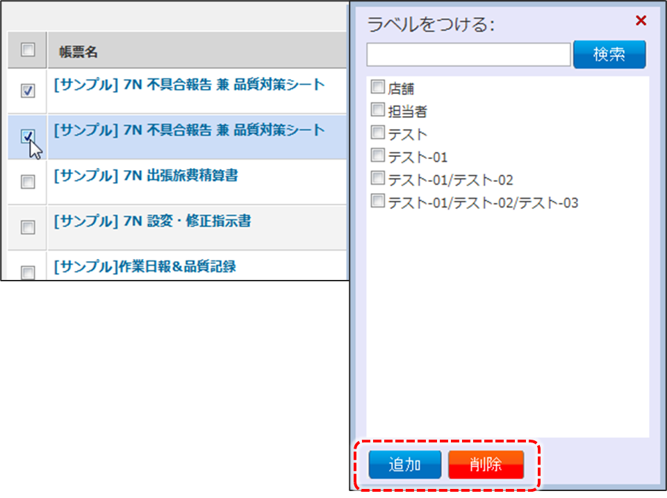 • ラベルの追加と削除 帳票定義、入力帳票のラベルは、詳細画面での追加と削除だけでなく、一覧から選択した項目にまとめて設定もできます。